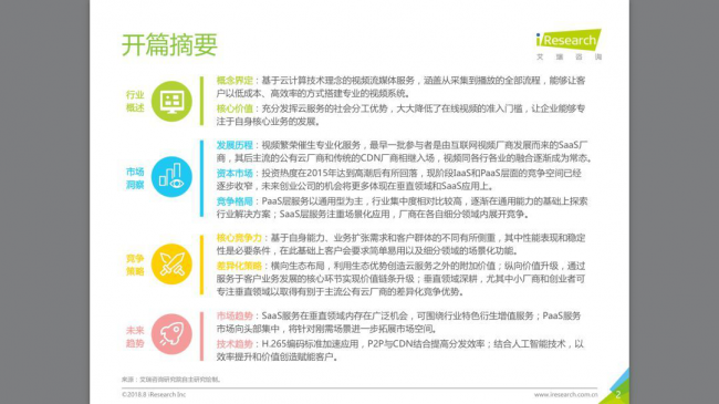 近日,知名分析机构iResearch(艾瑞咨询)发布《2018年中国视频云服务行业研究报告》,报告深入探讨了视频云市场的发展历程、市场状况、竞争格局及未来的市场趋势和技术趋势。
