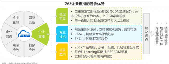 报告显示,从2015年263企业通信完成对展视互动(现263企业直播)的并购后,263企业通信产品线日臻完备,在产品、研发、运营上形成了企业邮箱、企业网盘、电话会议、网络会议、视频会议和企业直播等全线的企业数据通信产品服务能力,企业直播与263企业通信原有其他业务间优势互补,技术和资源的协同效应明显,促进263企业通信整体业务的快速发展。
