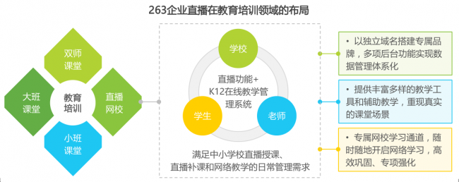 今年初,263企业通信开放包含“邮箱、会议、直播”在内的全线产品,以263教育为基点,通过“双师课堂、直播网校(K12)、大班课堂、小班课堂”四种形式的在线教育解决方案,不仅可以服务于体制外的各类教育培训机构,更凭借名校网络课堂、应急响应教学等各类直播网校应用场景攻克体制内市场,真正做到让通信赋能教育,彼此成就,共同成长。