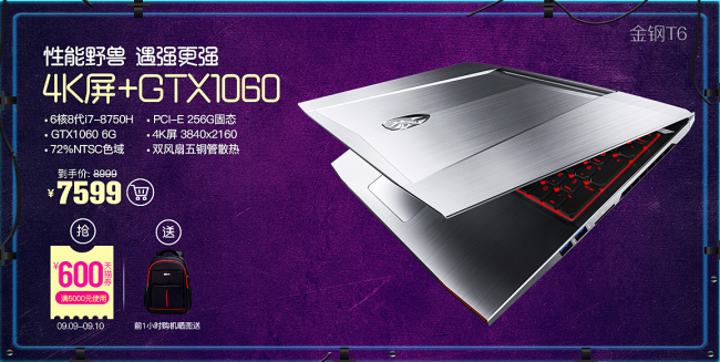 金钢T6延续了金钢系列的炫酷外观,A面金属拉丝工艺设计+3D水晶发光立体logo;除了极高的颜值外,在性能上也十分出色,采用第八代智能英特尔® 酷睿™ i7-8750H 处理器、GTX1060 6G独显,搭载8G高频率内存,256G SSD+1T HDD,游戏秒速载入,给玩家带来极速的操作体验。2代光电轴体机械键盘,操作得心应手;双风扇五铜管+一键骤冷散热系统,无惧高温,享尽游戏快感。采用72%色域高清4K屏,怪兽版更是配备了144Hz 72%色域IPS电竞屏,可视角度和色彩还原度极高,画面更加生动流畅,让你在游戏中占尽先机。