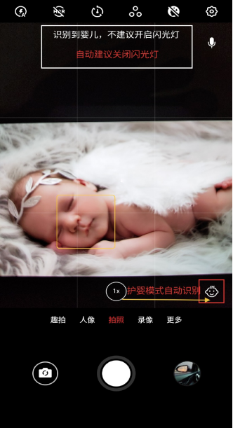 并且,在系统识别出拍摄对象为婴儿时,自动屏蔽闪光灯功能,防止闪光灯误伤宝宝视力。若拍摄者手动打开了闪光灯,系统会提示「识别到婴儿,不建议开启闪光灯」,让新手父母可以更安全地给宝宝拍照。