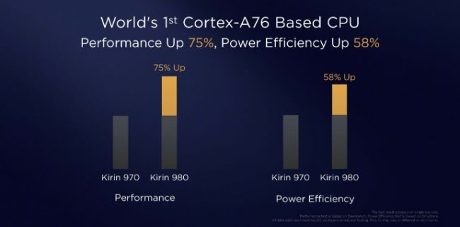 在CPU方面,麒麟980全球首次实现基于ARM Cortex-A76的开发商用,与上一代相比单核性能提升75%,能效提升58%。为了满足用户对手机更快、更持久的体验需求,在上一代多核架构的基础上,麒麟980此次创造性地设计了2超大核(基于Cortex-A76开发)、2大核(基于Cortex-A76开发)、4小核(Cortex-A55)的三档能效架构,提供了更为精准的调度层次,让CPU在重载、中载、轻载场景下灵活适配,从SoC整体设计上更大地发挥出性能和能效优势。性能强劲却又能收放自如,这是高手与莽夫的本质区别。