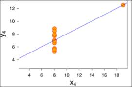 按照相关系数计算公式,x和y的相关系数比较高,原因是因为一个异常点的存在,如果去除掉这个异常值,则x和y没有相关性可言。但如果没有进行数据分布的分析(可以参考离群点检测的一些方法,这里不展开),则认为x和y是强相关了。