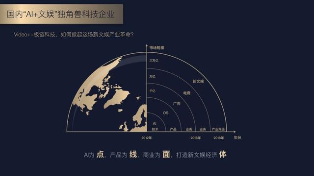 恰逢极链科技Video++正在做的,就是在经过对新文娱市场的全面考察之后,利用AI技术赋能新文娱产业。目前,Video++极链科技遵循“AI为点、产品为线、商业为面、打造新文娱经济体”的集团化发展路径,在AI文娱赛道上已经取得成果,形成了由AI营销平台、文娱电商、互动娱乐、新IP主题商业等组成的业务矩阵,并通过AI挖掘互联网最主流的几种变现机会,如广告、电商、游戏等,以多样化的消费形态来撬动新文娱的价值。