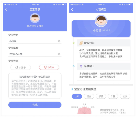 在APP端上,父母可以输入孩子的个人信息(性别、出生日期),飞伴就会根据信息给出孩子的心理成长模型,分析某一阶段的孩子会喜欢什么,应该让孩子学习什么,并且还会推送相关的教育内容,让父母进一步有针对性的引导孩子成长。另外还有定时关机、定时提醒、童锁、微聊等功能,每当孩子在晚上听睡前故事、听睡眠歌曲的时候,可以事先在APP上设定好时间,时间一到就会自动关机,十分好用。