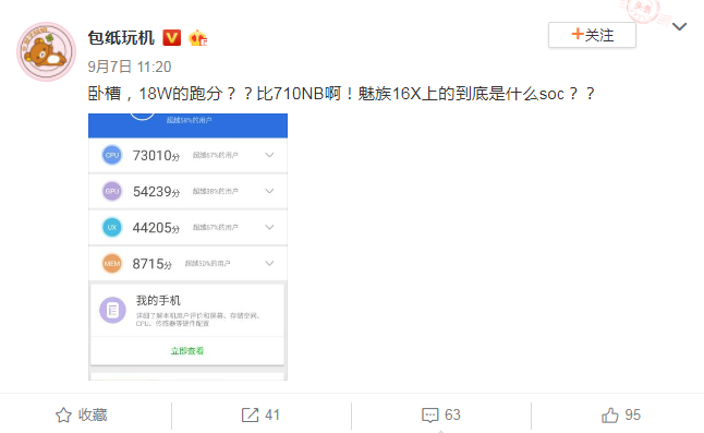 根据黄章的消息,魅族16X搭载的是骁龙710,标配屏幕指纹识别。换句话来说,跑出超18万分的魅族16X,搭载的是骁龙710!要知道骁龙710的平均跑分只有16万~17万分左右,魅族16X是怎么做到18W的跑分呢?有网友猜测,魅族16X可能作出了一些独特的优化,提升了CPU的性能,同时16X还有Flyme系列的加持,软硬件优化都十分出色,所以跑分自然就上去了。