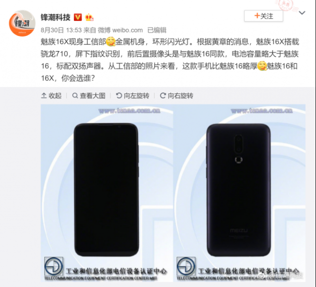 而从工信部的认证照片看来,魅族16X背面也配备了环形闪光灯,而@锋潮科技 也表示魅族16X采用与魅族16相同的前后摄像头方案。也就是说魅族16X也拥有2000万前置摄像头,而后置摄像头则为1200万+2000万像素。