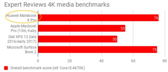 在硬件4K专业对比中,华为得分超过了苹果、戴尔和微软。