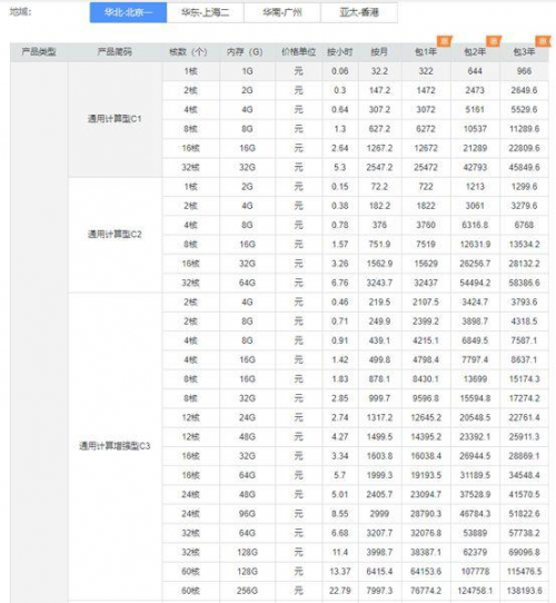 华为云中C3实例与C1、C2实例对比,C3实例拥有更多更高的配置类型。相比于C2实例最高32核64G,C3实例最高可达60核256G;CPU与内存比例从原来的1:1或1:2升级到C3的1:2和1:4,配置更高,计算能力更强