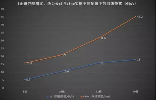在华为云C3ne实例正式商用之前,E企研究院针对C3与C3ne实例不同配置下的网络性能进行了测试,检验其在真实环境下的网络性能,下图为测试结果: