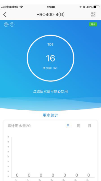 U+APP的设计非常的简洁,水质TDS值很直观的显示出来,还有每日、每周、每月的用水统计,可以帮助大家合理规划日常的饮用水。