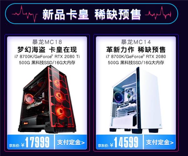 名龙堂这次还发布了两款搭载RTX20系显卡的主机并且开启预售。其中暴龙MC18配备了最新卡皇GeforceRTX2080Ti,搭配英特尔酷睿i7-8700K处理器,旗舰级组合性能简直不要“Ti”强悍,除此之外主机还配备16G内存以及高速NVMeM.2,尽享数据高速传输所带来的游戏快感。