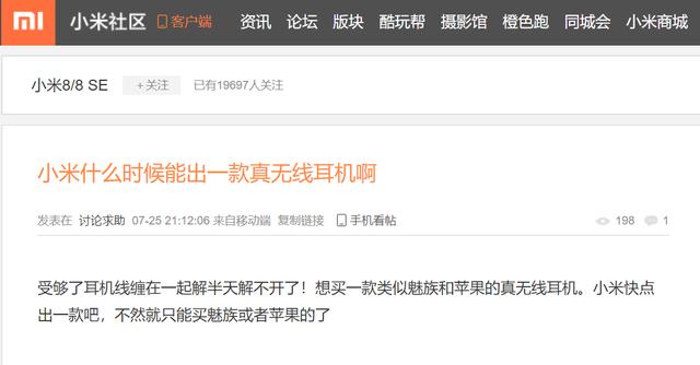 再说智能耳机。进入智能时代以来,耳机智能化和无线化的趋势越来越明显,尤其是年轻用户,对乱成一团的耳机线的容忍性越来越差。面对这种趋势,以小米生态链企业万魔声学为代表的耳机生产商不断推陈出新,打造了1MORE等众多知名的蓝牙无线耳机品牌。但在真无线耳机领域,却仍只有苹果的AirPods表现抢眼,其他所谓的真无线耳机都差强人意,而很多米粉都在小米社区、MIUI论坛上疾呼:小米什么时候才能推出高性价比的真无线智能耳机呢?