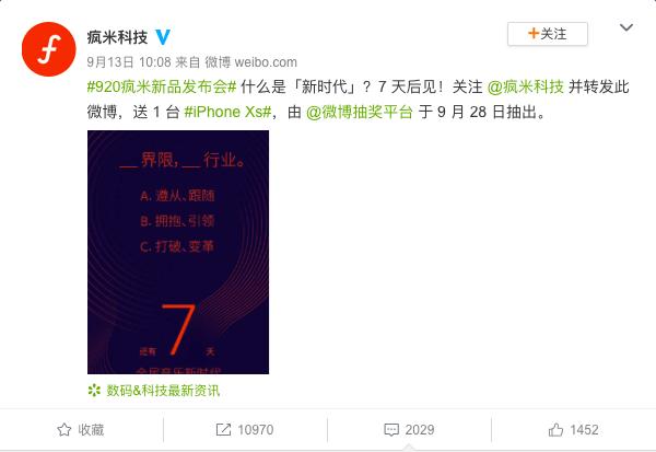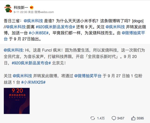 近日,微博上有一个名为「疯米科技」的蓝 V让人发出了这样的感叹。原因何在?原来,除了宣布9月20日开发布会以外,他在微博中每天都要送出1台手机!小米8、iPhone XS等等,应有尽有,简直是壕无人性!