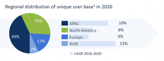 从全球来看,到2020年每用户平均收入(ARPU)约为50美元,但ARPU值在不同区域上差别很大,亚太地区约为18美元,北美地区超过86美元。尽管亚太地区目前用户平均收入水平较低,但预计到2020年亚太地区将实现最高增长,复合年增长率超过18%,远超北美地区的10%和欧洲地区的9%。