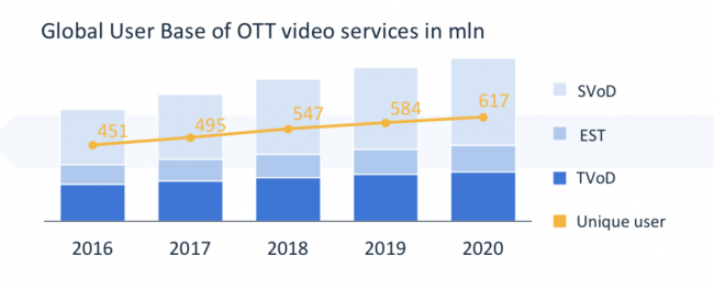 预计到2020年,全球有将近6.17亿OTT用户