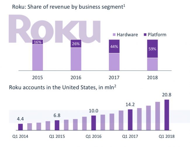 2018年将是Roku运营收入超过其设备销售额的第一年。其广告业务增长速度最快,在2016年广告收入约为5700万美元,而预计到2018年,其广告收入将接近3亿美元,相当于3年增长了5倍。