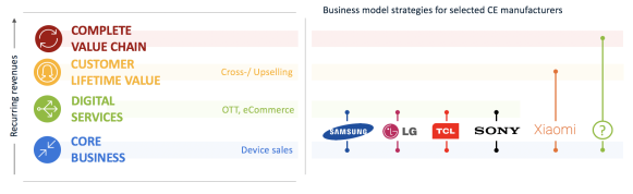 白皮书对目前全球主流厂商的商业模式进行了分析。如三星、LG和索尼等老牌厂商主要仍靠硬件销售实现盈利,在数字内容服务领域已经被亚马逊和Netflix等大型全球型和地区企业所占据。中国的OTT企业为了能够实现整个生态闭环,放大商业价值,采取了与传统硬件厂商不同的商业模式,并不完全依赖于硬件盈利,而是向内容端发力,以吸引大量用户为数字内容服务付费,并且可以进一步实现其生态系统内产品的交叉和价值最大化。