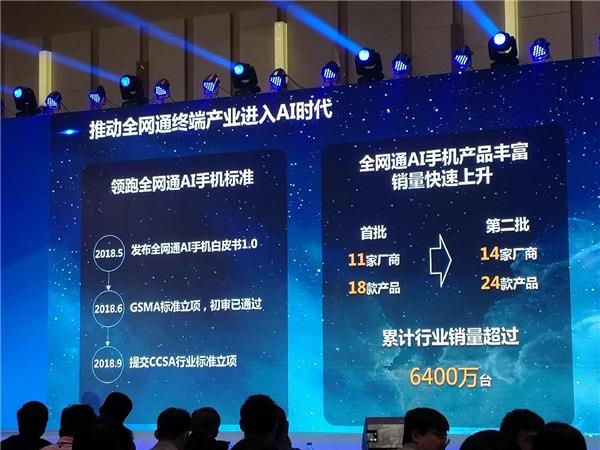 事实上,中国电信正全面推动全网通终端产业进入AI时代。中国电信于2018年5月发布了全网通AI手机白皮书1.0;6月在GSMA标准立项,初审稿通过;9月提交CCSA行业标准立项。全网通AI产品持续丰富,销量快速上升,第一批11家推出18款产品,第二批14家推出24款产品,累计行业销量6400万。