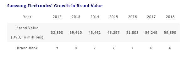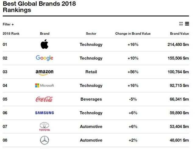 近日,全球领先的品牌咨询公司Interbrand公布了“2018年全球最佳品牌榜”。三星电子相较去年品牌价值提升6.5%,以599亿美元的品牌价值稳居该榜单第六位,同时这也是三星电子连续两年排名第六,排名前五的分别为苹果、谷歌、亚马逊、微软以及可口可乐。