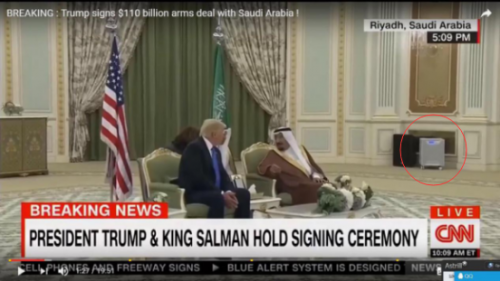 据小编了解,在CNN对美国总统特朗普访问沙特阿拉伯的新闻报道中,眼尖的网友会发现,在会见特朗普王宫的右上角摆放着一台四四方方的仪器,正是Airgle(奥郎格)的AG900空气净化器,在特朗普访问沙特期间,沙特国王用它来接待他。