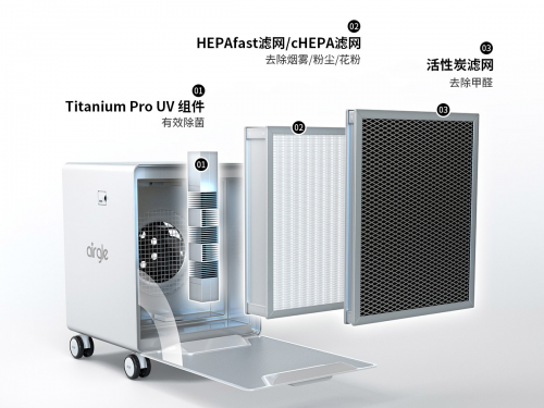 高吸附椰壳活性炭+滤网(cHEPA滤网/HEPAfast滤网)+Titanium Pro UV 组件:低风阻、无臭氧、净化快,多重过滤,cHEPA滤网的净化速率是目前市场上HEPA网的100倍,让每一次呼吸都健康舒畅。