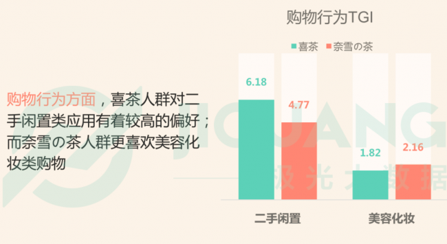 近期,极光大数据发布了一份有趣的报告,以喜茶和奈雪の茶客群作为研究对象,多维度分析了网红奶茶店消费人群的特点,在其发布的《2018年Q2网红奶茶店人群研究报告》中显示,喜茶人群和奈雪の茶人群对二手闲置类应用关注度都较高。
