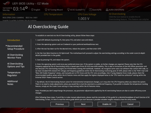 使用AI智能超频,最简单的方法是借助UEFI,无需安装任何软件,BIOS中甚至还内置了详细的使用指南。如需查看此指南,可在系统首次启动时按“Delete”键进入UEFI,然后单击屏幕顶部的“AI OC Guide”。当您进入UEFI时,按“F11”键也会显示此指南。