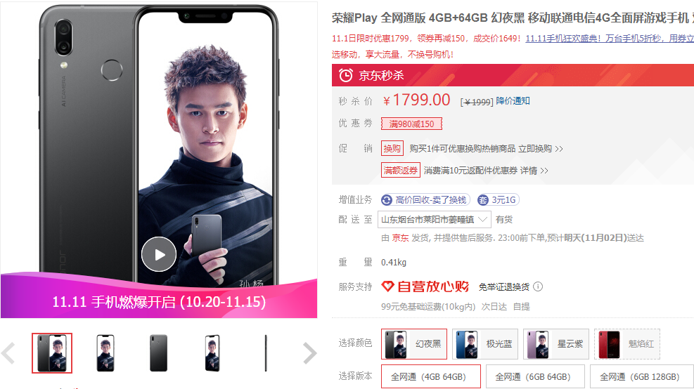 按照内存组合不同,荣耀Play分为三个版本,其中4+64GB版发布时售价1999元,6+64GB版2399元,6+128GB版发布时售价诡异,居然和6+64GB版一样,同样为2399元。目前,三个版本在京东的优惠价分别为1649元、1809元、2399元,其中6+64GB版优惠幅度达到590元。