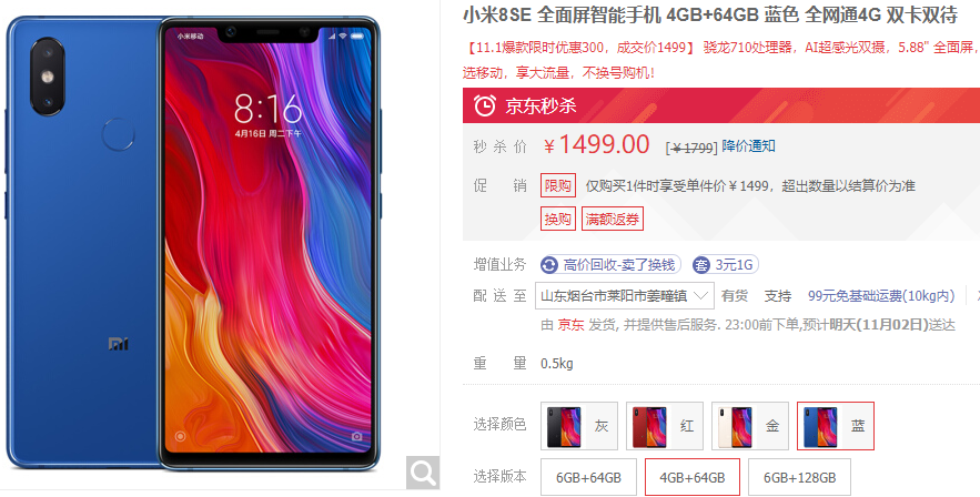 小米8SE发布于今年年中,发布时,4+64GB、6+64GB和6+128GB三种版本售价分别为1799元、1999元和2299元,目前京东售价分别为1499元、1649元、1799元,其中6+128GB版优惠力度最大,为500元。