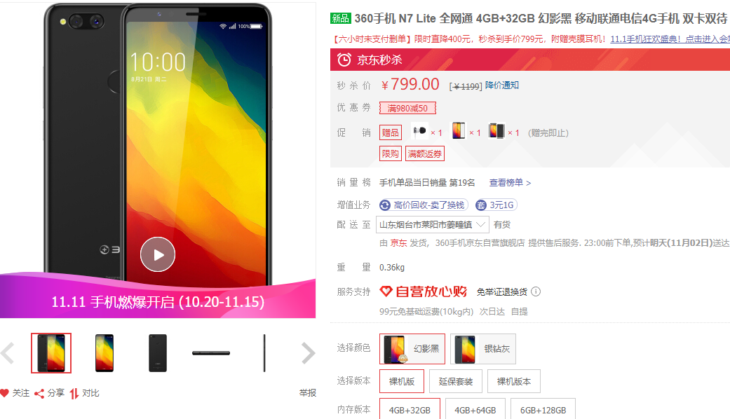360手机N7 Lite 4+32GB、4+64GB和6+128GB版此前售价分别为1199元、1399、1799元,双11京东优惠价仅需799元、1099元和1588元,其中4+32GB版优惠力度为400元,其他两种版本也分别达到了300元、211元。