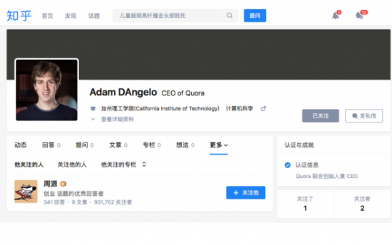 亚当·安捷罗除在知乎提问之外,他在入驻知乎当天即与知乎创始人、CEO周源相互关注,这一幕的发生充满了故事性,也让网友们纷纷猜测。