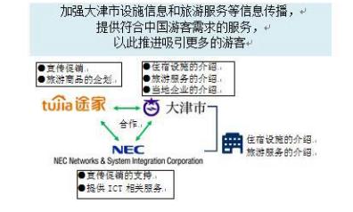 三方将积极向中国游客介绍大津市当地的还不为人知的隐秘性名胜古迹和旅游服务,同时通过提供Wifi连接和移动支付服务等提升中国游客的使用便利性,并通过对这些积累下来的旅游数据进行市场调查,共同开发符合中国游客需求的实地体验消费等旅游商品,为增加游客数量和促进地区经济发展做出贡献。