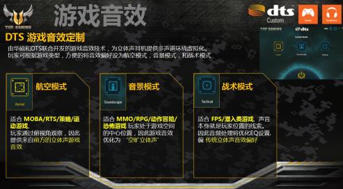 值得一提的是,它在高品质板载声卡的基础上特别新增了DTS游戏音效定制技术。这是华硕携手DTS联合开发的游戏音效技术,为立体声耳机提供多声道环绕虚拟化。让玩家可根据游戏类型,将音效偏好设为航空模式(适合MOBA/RTS/策略/运动游戏),音景模式(适合 MMO/RPG/动作冒险/恐怖游戏)和战术模式(适合 FPS/潜入类游戏),进而带给玩家更逼真、更震撼的游戏音效以及更精准的声音定位。