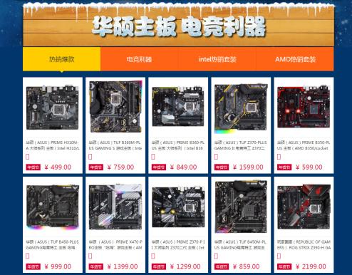 在“华硕主板 电竞利器”专区,“热销爆款”、“电竞利器”、“Intel热销套装”、“AMD热销套装”四大类共40款主板任你选择。其中囊括了TUF B360M-PLUS GAMING S、ROG STRIX Z390-E GAMING、ROG M11H(WIFI)等Intel平台利器,以及TUF B450M-PLUS GAMING、ROG STRIX B450-F GAMING等AMD平台利器。此外还有TUF B360M-PLUS GAMING S搭酷睿i5-8500、PRIME Z390-A搭酷睿i7-9700K等超值板U套装,广大玩家们可随心选购,打造自己心仪的高性能电脑。