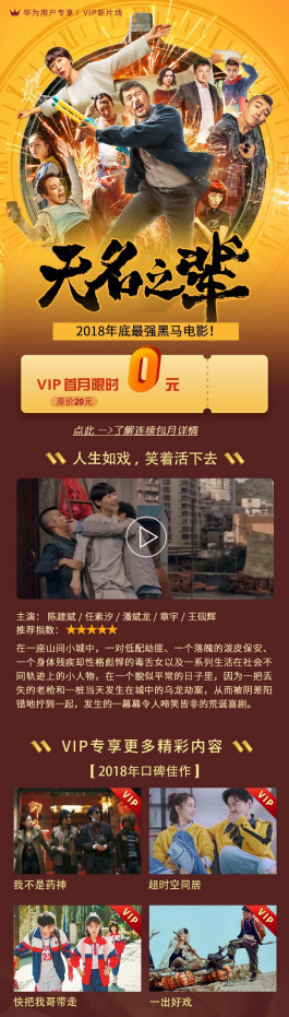 1月3日华为视频全网首播《无名之辈》,同期还有“新用户首月0元”会员权益活动邀你同享。即日起至2月3日,凡华为视频VIP会员新用户,首次开通连续包月服务,即可享受“首月0元” VIP会员福利,品质大片随时看!