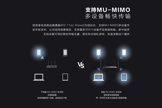 在功能上,联想拯救者路由器上所支持的MU-MIMO功能,一改传统路由器连接多台设备时智能轮流进行数据传输的天生弱点,实施多设备数据同时传输让再多的人到访也能一起轻松开黑。