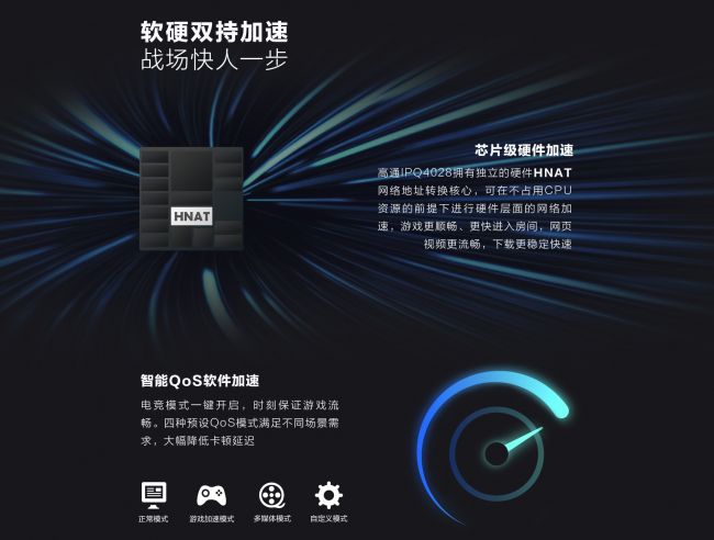 而高通IPQ4028芯片所拥有的HNAT网络地址转化核心,可以在不占CPU资源就能实现硬件加速;配合电竞、多媒体等一键切换的四种网络模式,可以轻松面对家庭中的各种网络使用需求。此外路由器还内置不少贴心小功能,4G备份可以为你带来更稳定的4G热点,IoT智联可以让拯救者路由器控制家中所有智能物联设备,还有共享打和文件共享等功能都可以让你的生活更加便利。