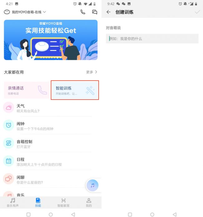 指令识别方面,荣耀YOYO智能音箱表现也是非常不错的。无论是快语速、方言都能很好的进行识别。而且在App中,还提供了智能化训练,可以让用户自行设定指令的回答方式,并且用户可以直观的看到对话内容,并支持对其进行修改,使荣耀YOYO智能音箱变得更聪明,更符合你的需求体验。