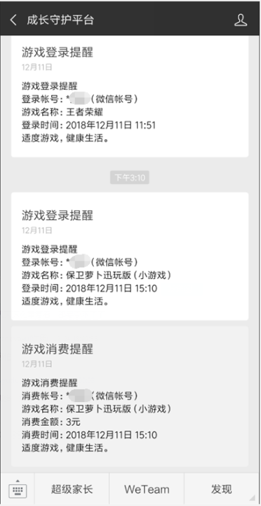 小游戏全面接入“成长守护平台”之后,家长可以及时了解到未成年人游戏及消费动态,开发者也可以根据2018年4月25日发布的防沉迷接口提示用户合理、健康的控制游戏时间。