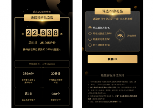 基于平台数据,本次“最佳客服”评选活动,我们为各位客服坐席定制了客服工作“账单”,坐席可以清楚看到2018年一整年的工作记录以及好评率,同时可以根据自己的强项进行选择性PK,以此争夺“最佳客服”称号。