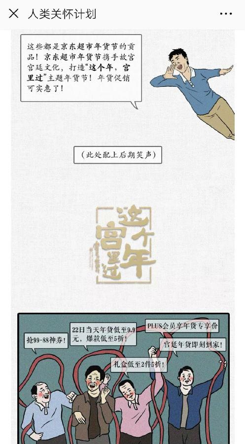 至此,京东超市借人类关怀计划的长图,将这次IP营销的高度进行了升华,丢出了自己关于如何呈现更新奇更有趣的年货节的思考。