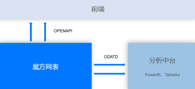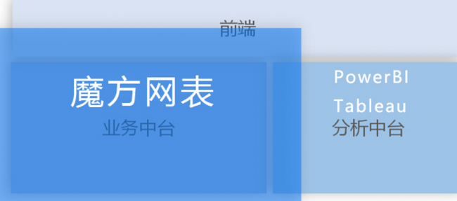 魔方网表是典型的业务中台产品。它属于运营工具范畴,它给运营人员提供一套工具套件,使他们自己可以不依赖于专业开发者,快速构建业务所需要的应用,并能够随时对应用进行改进。包括但不限于把Excel在线化、实时在线报表、电子流、指标报警、跟踪提醒等。魔方网表是一个开放的平台,所有应用都是天然API化的,可以被其它系统调用;可以连接其他数据库和API服务,自动同步,这个特性可以用于快速扩展现有系统的功能。提供ODATA接口,可以作为Excel,PowerBI和Tableau的分析数据源,生成报表。如下图所示