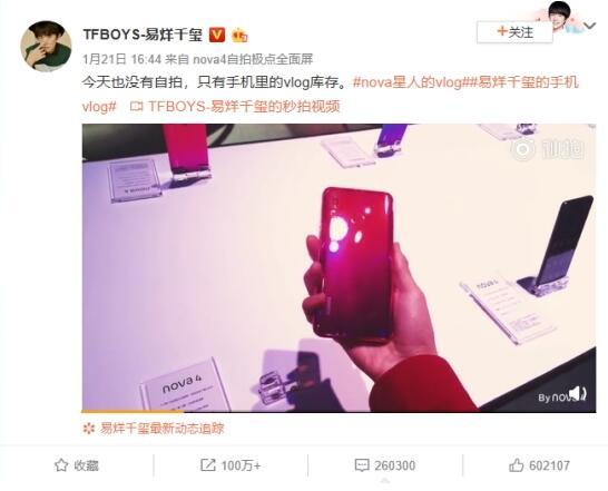 说起视频日志(VLOG),相信大家都会不陌生,vlog开创的用镜头捕捉世界、记录生活的新社交模式已火遍了全球。此前,四字弟弟易烊千玺便在微博上放出了亲自入镜的vlog,该支vlog全程用华为nova4拍摄,揭秘了发布会台上台下的故事。一经发布便热度大增,迅速登上了微博vlog页面推荐位,带给了“千纸鹤”们与爱豆零距离接触的感受。