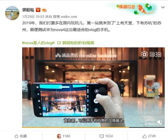 在微博拥有百万级粉丝的时尚达人 微博vlog博主@郭姐哒 更是赞叹华为nova4是最适合拍vlog的手机,它所搭载的超广角镜头、视频美颜及暗光拍摄等功能,都成为了用手机拍摄vlog的一大神器。