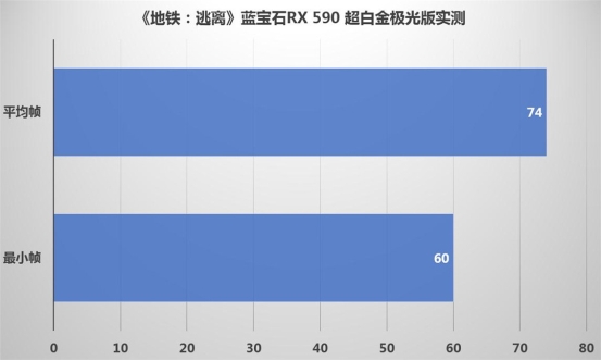 首先选择1920*1080分辨率,高画质,然后再利用Fraps软件进行帧数录制。从实测结果上看,蓝宝石RX 590 8G D5 超白金极光版的表现非常出色,平均帧数为74帧,最低帧数为60帧,达到了相当流畅的水平。