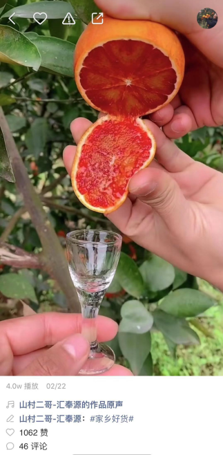 缪利是快手的老玩家,他最喜欢拍的视频是抓鱼摸虾,但是从来没有上过热门。直到有一次,他们在野游时,摘了几个当地的血橙,把切开来吃掉的视频传了出去,那红宝石一样瑰美多汁的水果,顿时无意中上了热门,于是有了成百上千的人来询问视频里的果实可不可以买。
