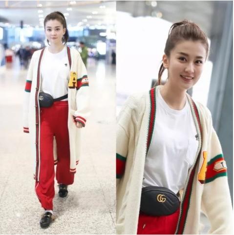 乔欣的Gucci白色大衣,具有校园风的图案,白色与红色的搭配十分俏皮,打造出了清纯可人形象。