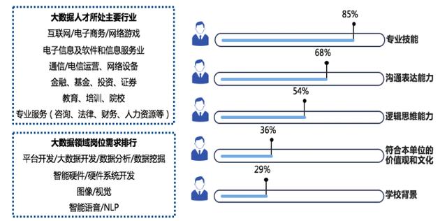 随着移动互联网、云计算、物联网等技术发展,全球数据呈爆炸式增长,大数据时代已然开启大幕。在迎接全球数字化挑战之际,可以高效处理大数据、利用大数据应用的人才是数字经济发展的坚实根基。大数据人才在世界范围内仍处于紧缺状态,从2016年起,我国开设“数据科学与大数据技术”本科专业,截至2018年3月,开设该专业的学校数量增长了近83倍。赛迪顾问研究显示,随着Spark\Strom等大数据平台应用的普及,企业对专业人才的需求日益增加,数据平台开发工程师、数据分析工程师、数据挖掘工程师等岗位炙手可热;互联网、电子信息、软件对于大数据人才需求量最大;专业知识和沟通表达能力成为企业对大数据人才聘用最重要因素。因此,大数据专业在课程设置上需注重人才的复合型知识架构,迎合市场需求和产业发展趋势。