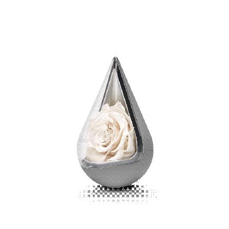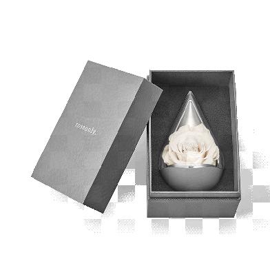 roseonly的白色永生玫瑰用富有设计感的水滴形灰色瓶身包装,内部的白玫瑰看起来显得更有质感。永生花也代表着爱永不凋零,为浪漫加分,爱TA,就给TA最永恒的美丽。